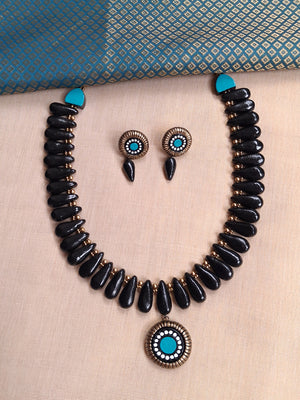 Terracotta Black Beaded Necklace with Turquoise Accent Pendant and Matching Earrings