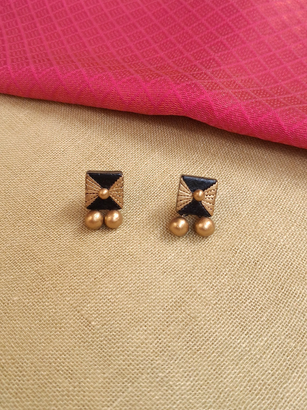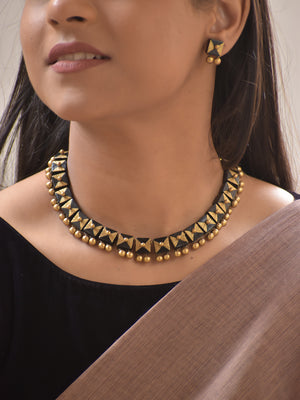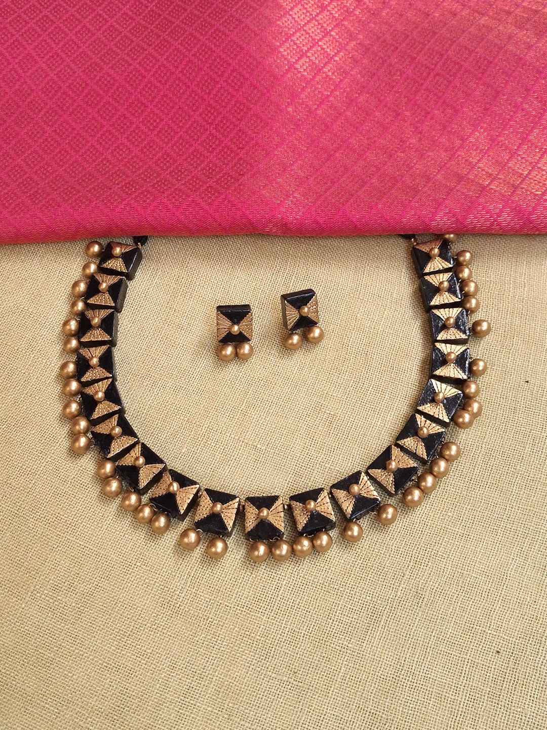 Terracotta Black Pyramid Beads Necklace Set with Golden Pearl Drops