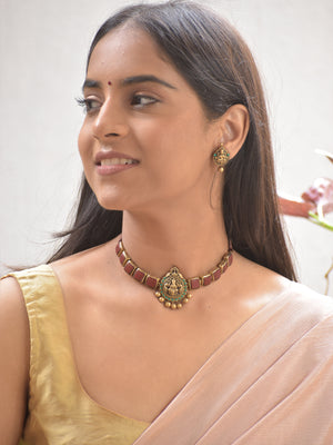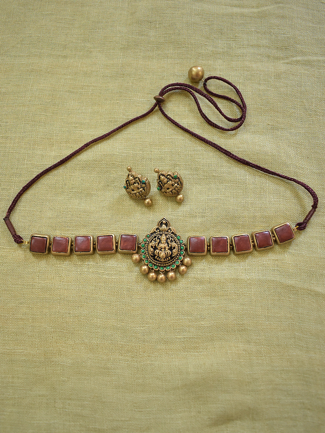 Terracotta Brown Square Stone Choker Necklace with Lakshmi Goddess Pendant & Earrings