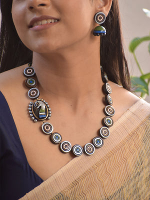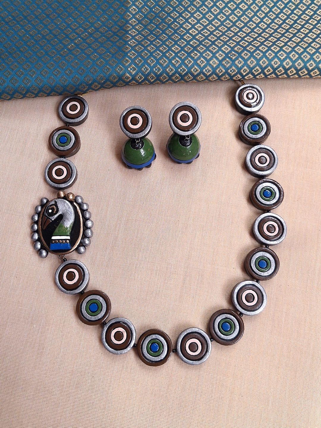Terracotta Circular Bead Necklace with Abstract Bird Pendant with Earrings