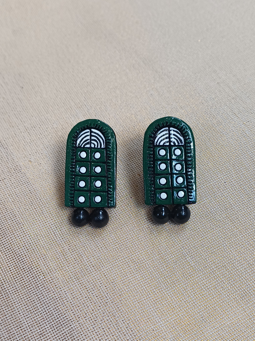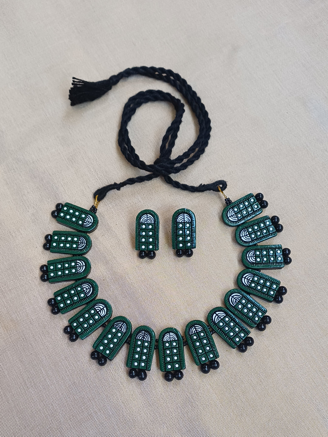 Terracotta Dark Green Hand-Painted Bead Necklace with Matching Earrings