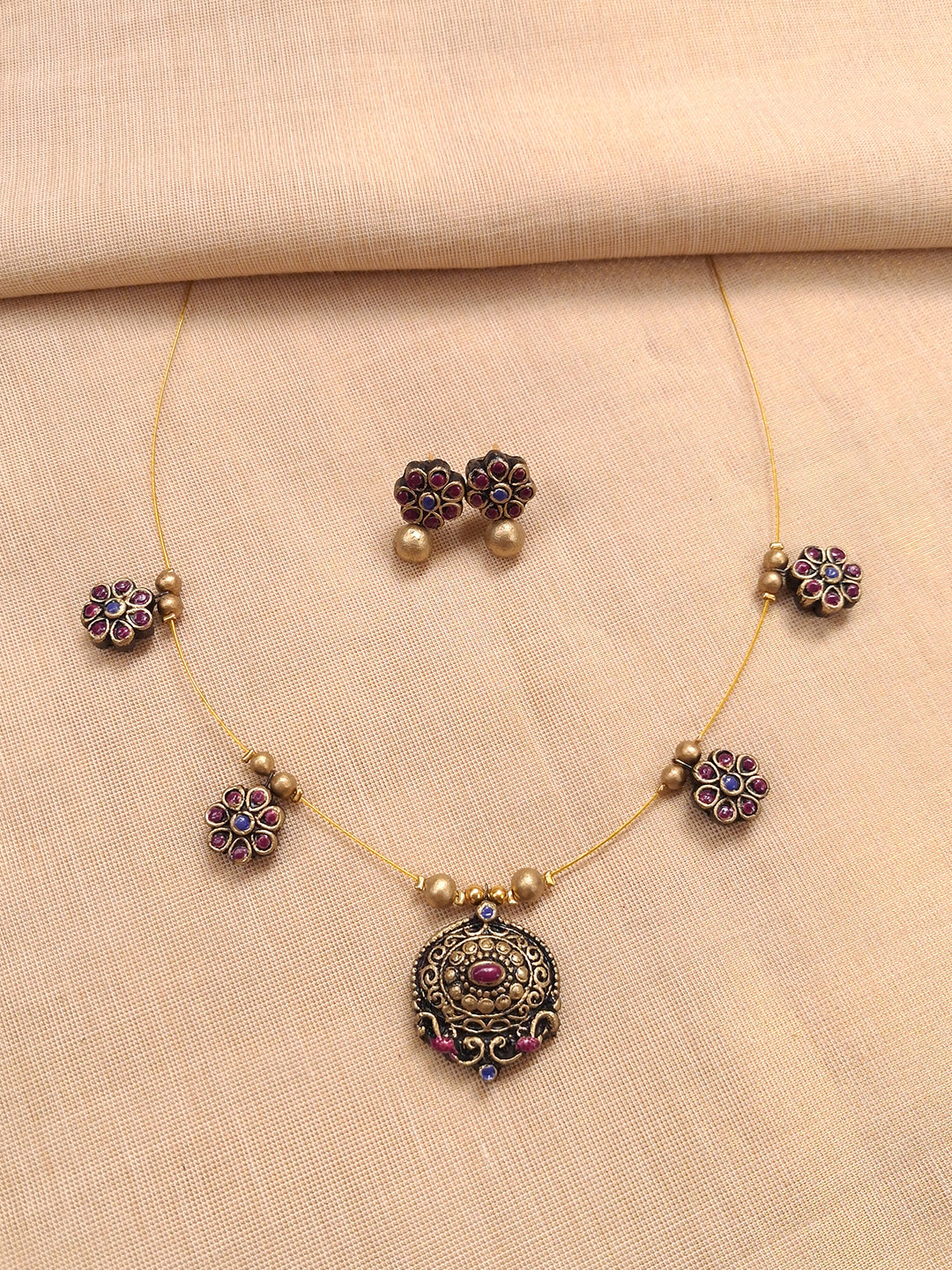Terracotta Floral Charm Necklace Set With Studs