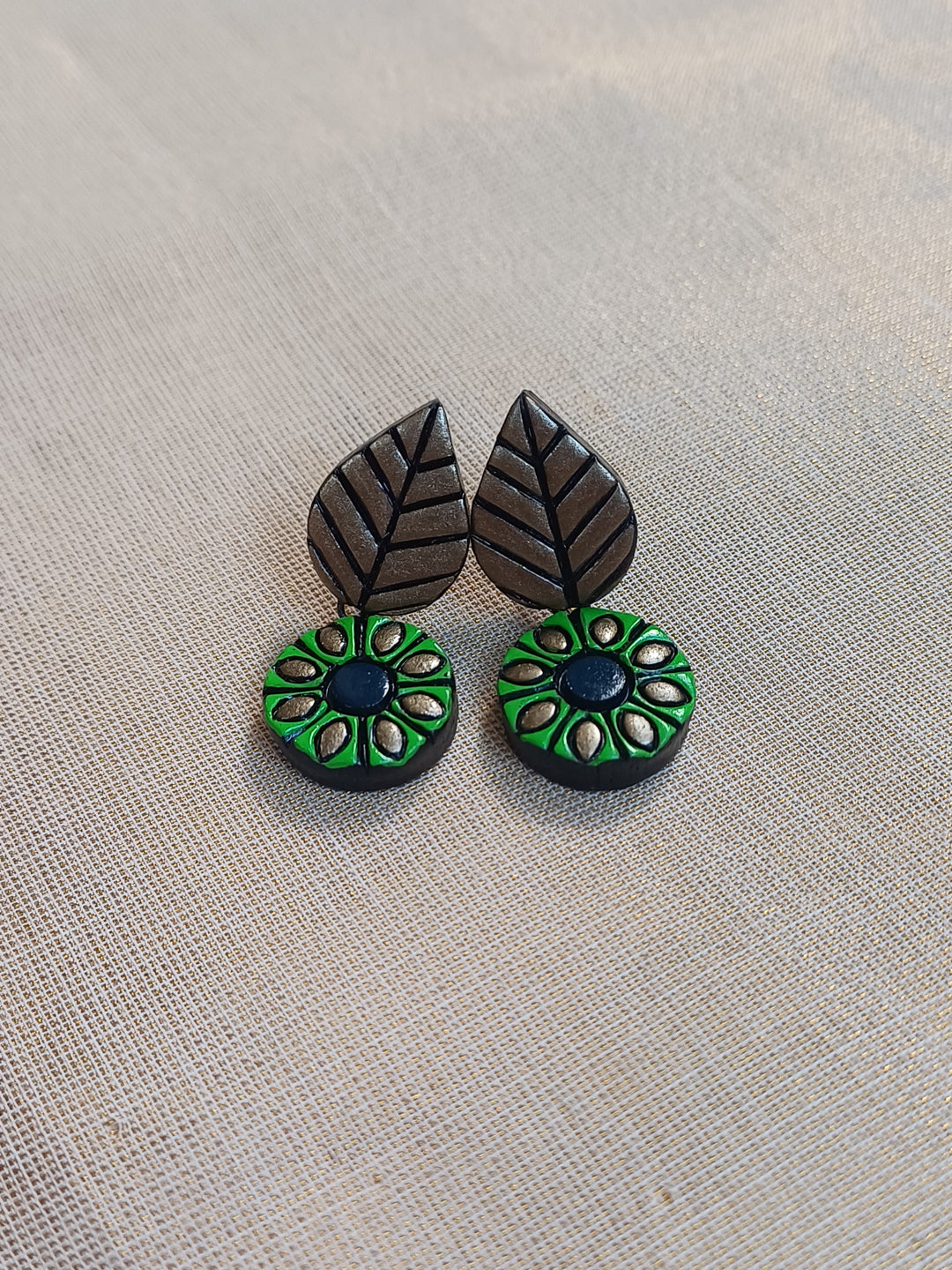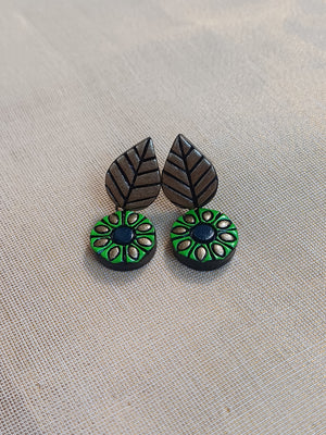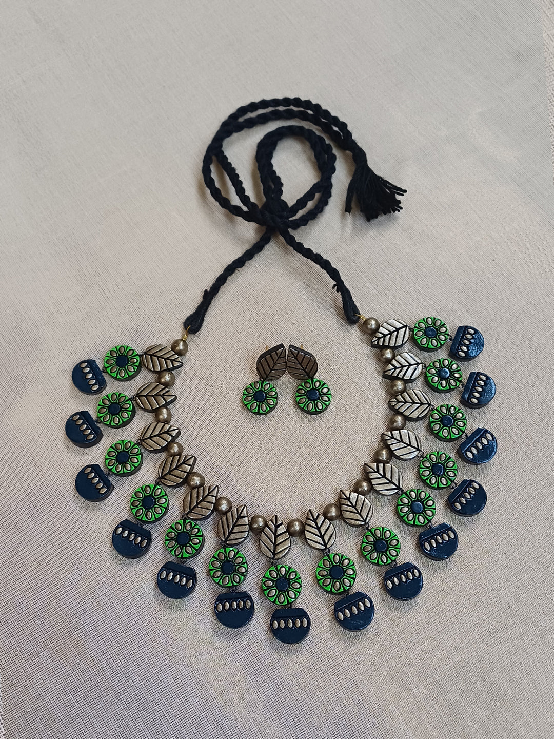 Terracotta Green Floral Motif Necklace with Leaf Accents & Earrings