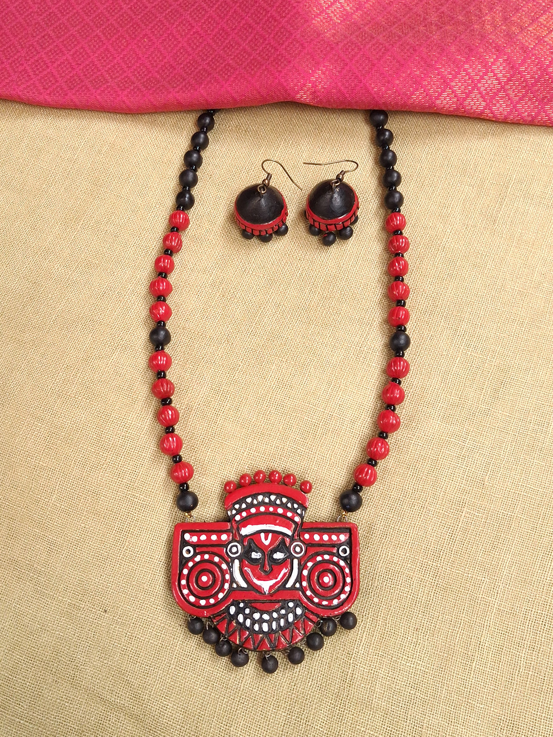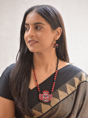Terracotta Kathakali Face Beaded Statement Necklace With Hanging Studs