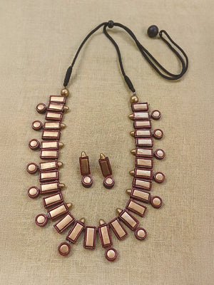 Terracotta Maroon Geometric Bead Necklace with Golden Accents & Matching Earrings