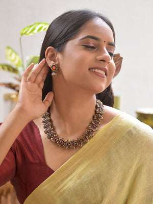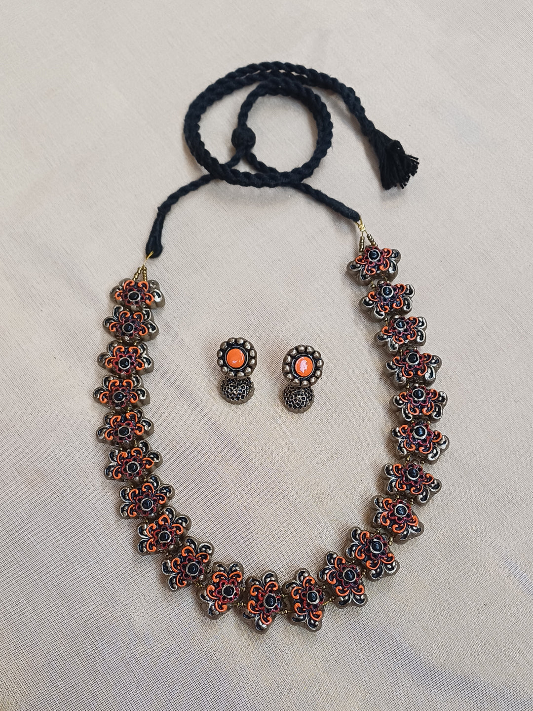 Terracotta Orange Floral Bead Necklace with Antique Black Accents & Earrings