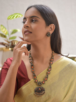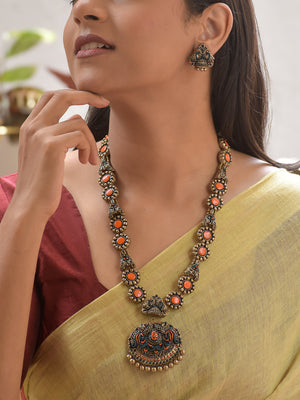 Terracotta Orange Round Bead Necklace with Peacock Motif Pendant & Earrings