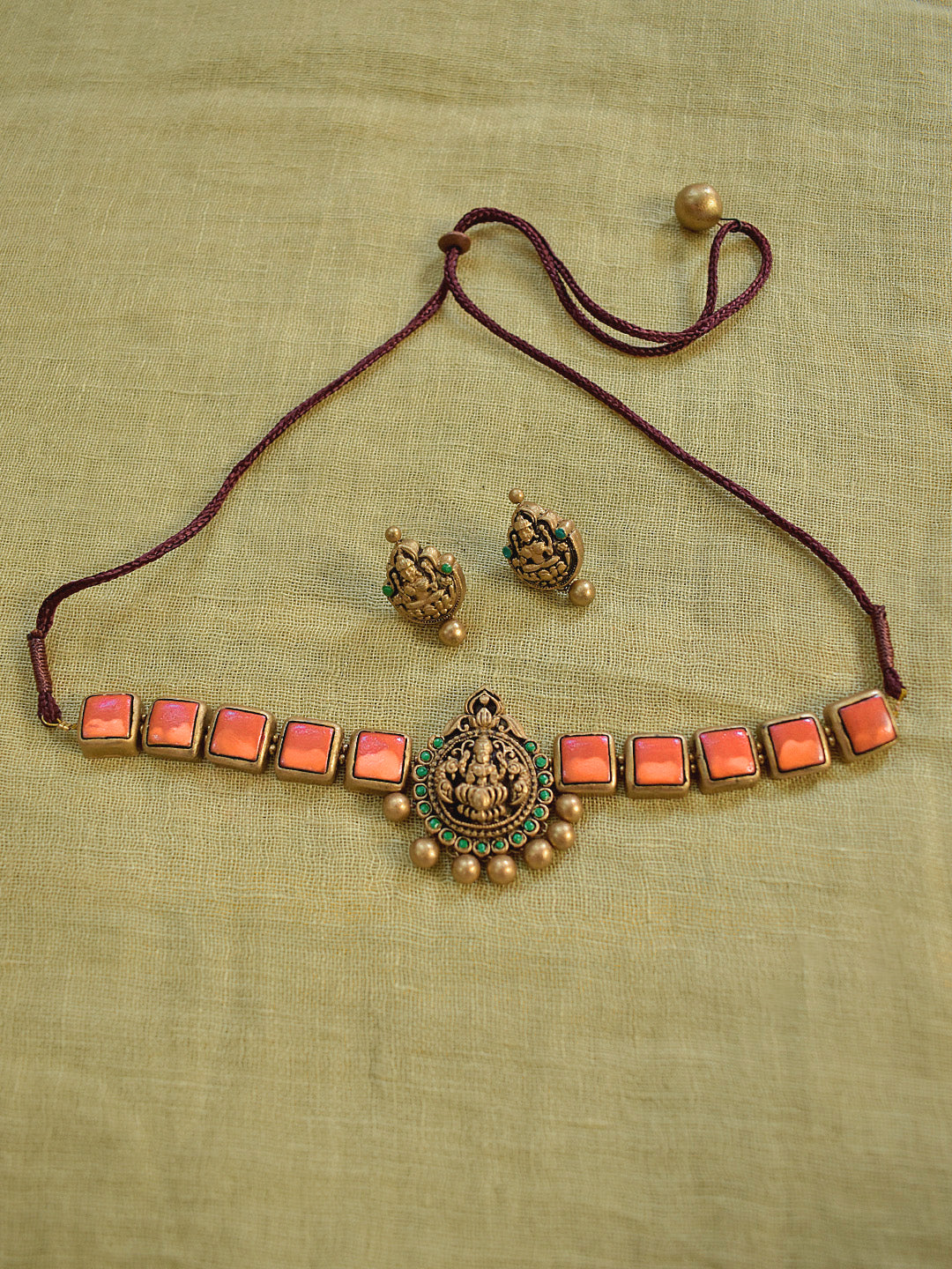 Terracotta Orange Square Stone Choker Necklace with Lakshmi Goddess Pendant & Earrings