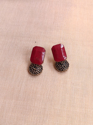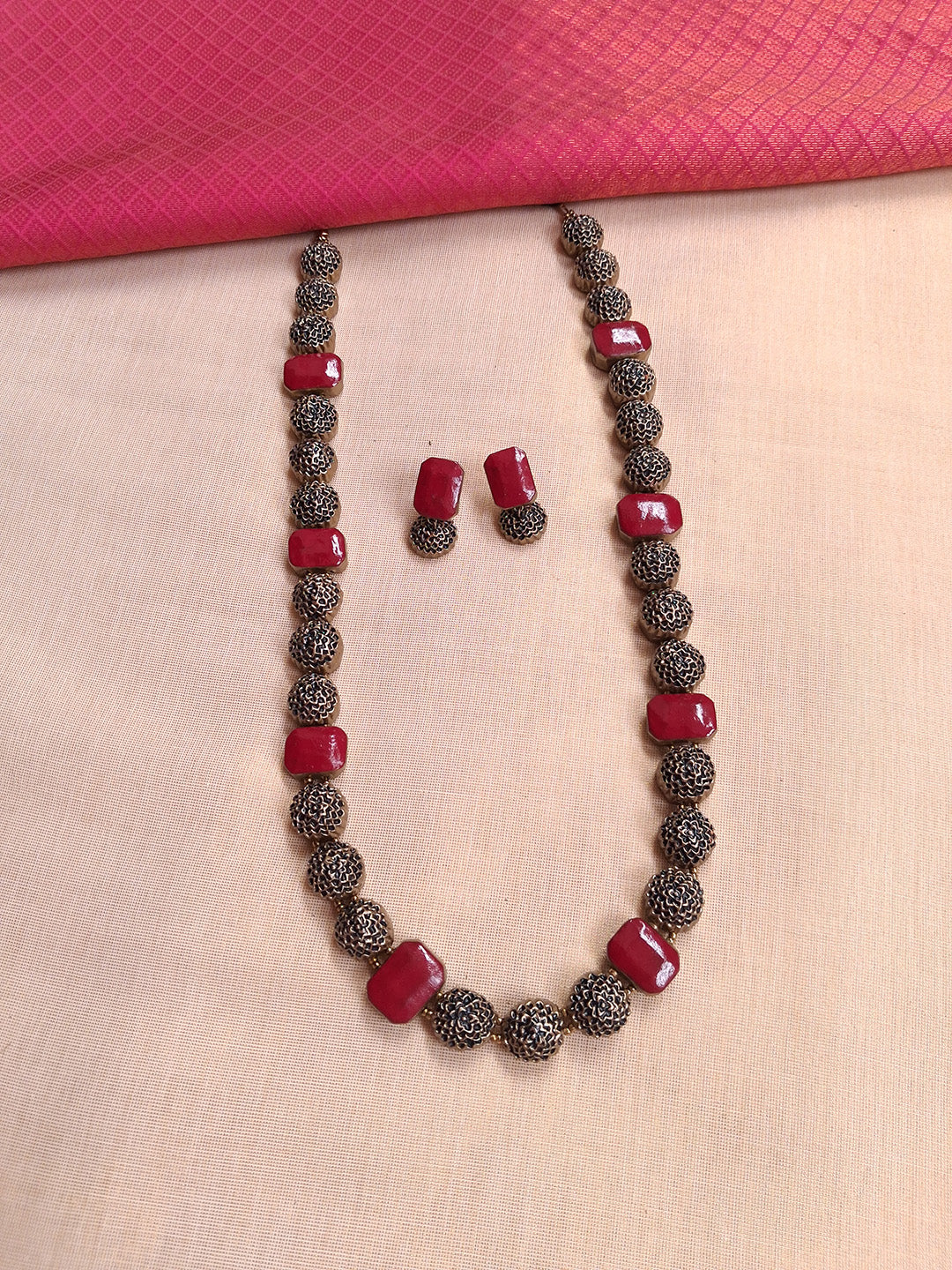 Terracotta Red and Antique Gold Beaded Necklace Set with Earrings