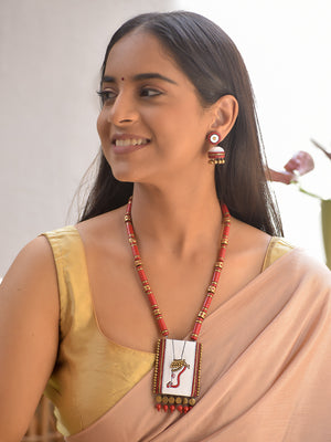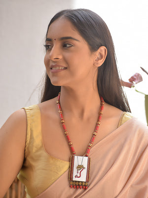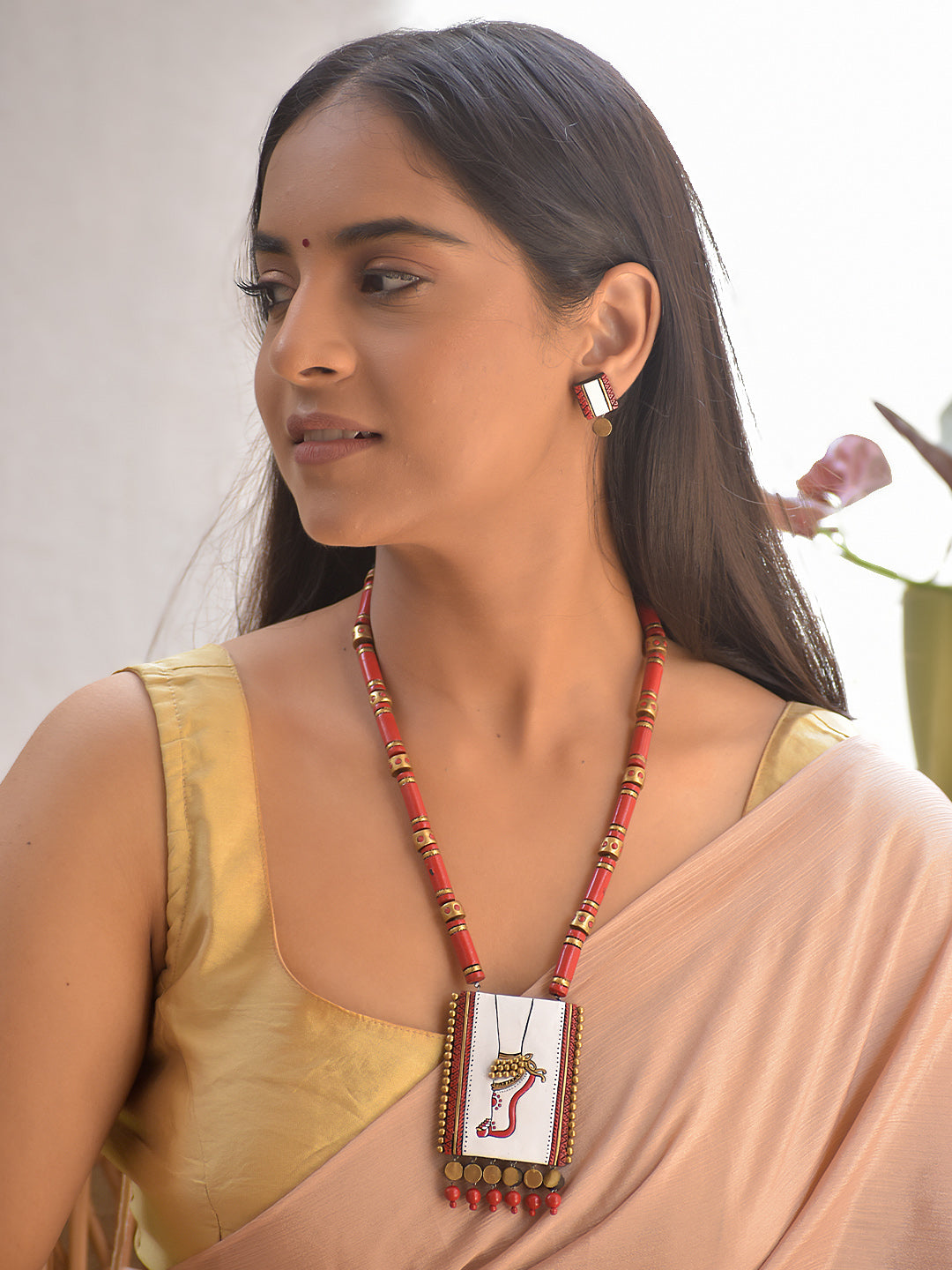 Terracotta Red Beaded Necklace with Hand-Painted Divine Foot Motif Pendant