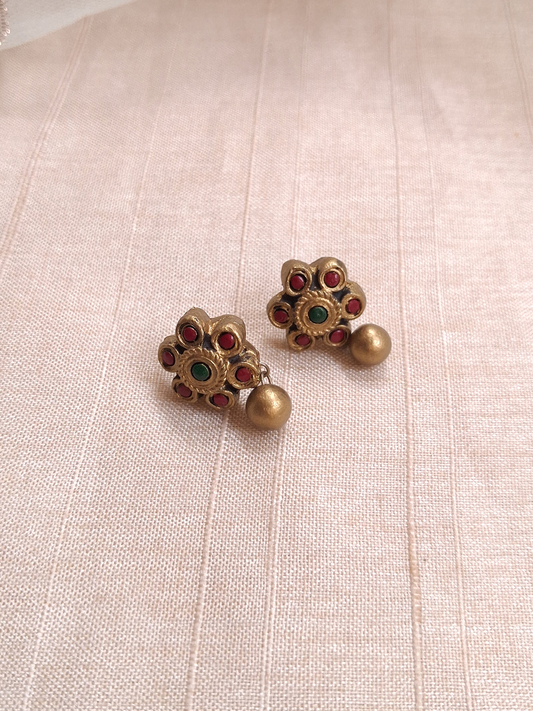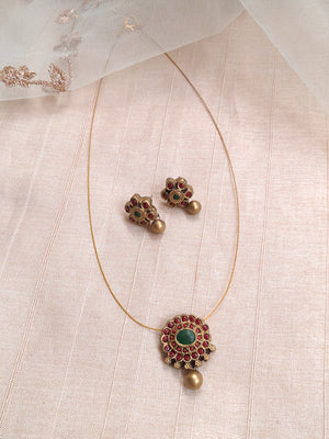 Terracotta Red Floral Pendant Necklace with Green Stone Center & Gold Bead Drop Earrings