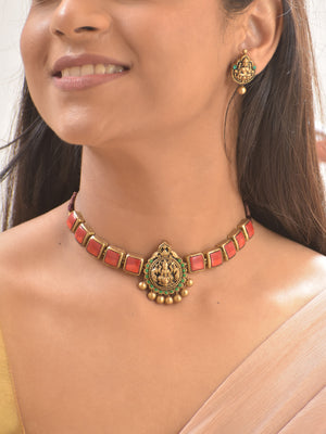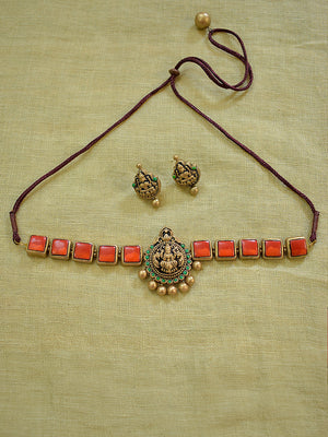 Terracotta Red Square Stone Choker Necklace with Lakshmi Goddess Pendant & Earrings