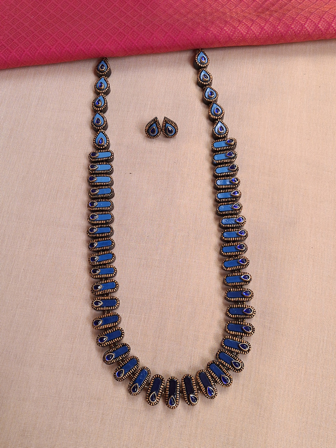 Terracotta Royal Blue Teardrop Beaded Necklace Set with Earrings