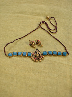 Terracotta Sky Blue Square Stone Choker Necklace with Lakshmi Goddess Pendant & Earrings