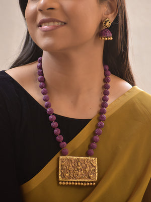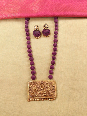 Vishwakanti – Handmade Terracotta Lakshmi Necklace Set with Purple Beads and Antique Gold Temple Pendant